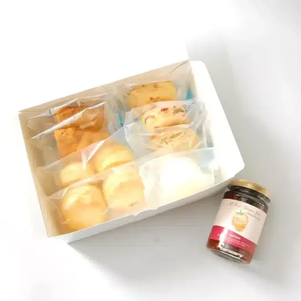 famfamのプレーンスコーン、リッチハニースコーン、セイボリースコーンがアソートになってジャム、クリームと一緒に届くお得なお試しセットです。お家でアフタヌーンティーを楽しんで頂けるよう、自家製のオリジナルスコーンクリーム、砂糖不使用ジャム(いちご又はりんごが届きますよう)もセットにしてお届けします。